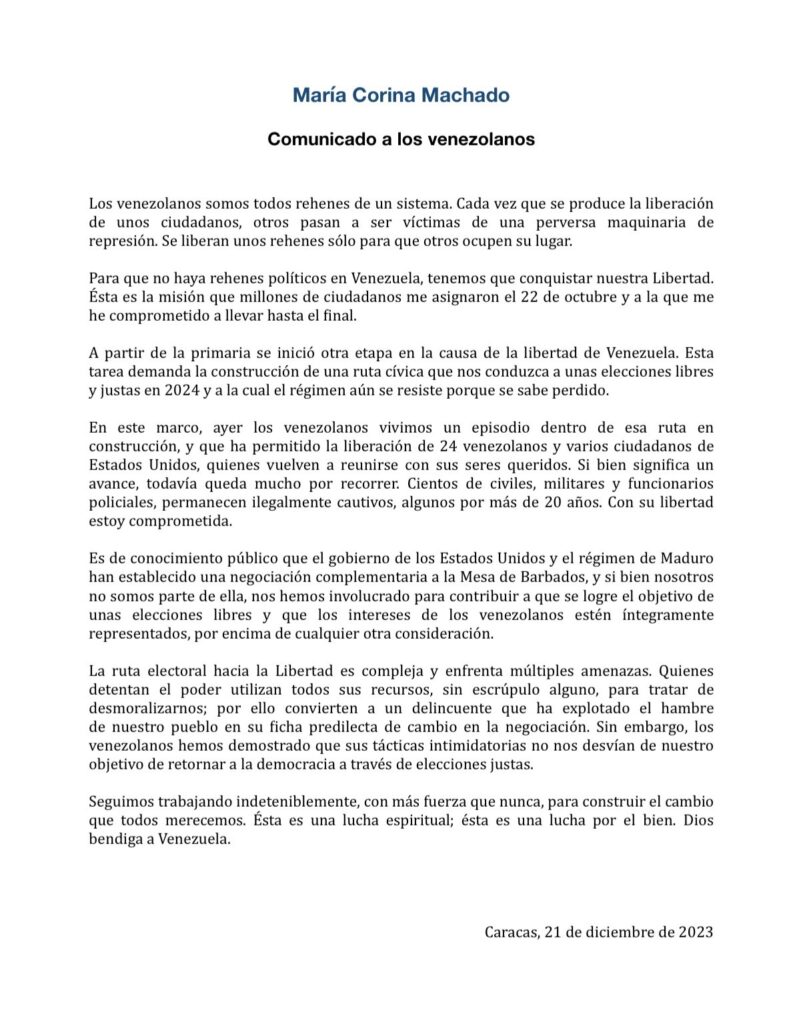 María Corina Machado publicó un comunicado este jueves 21 de diciembre en el que se posiciona sobre los últimos canjes entre el gobierno de Nicolás Maduro y el de Joe Biden que llevó a la liberación del empresario Alex Saab, detenido en Estados Unidos, y varios ciudadanos estadounidenses y venezolanos que estaban privados de libertad.
