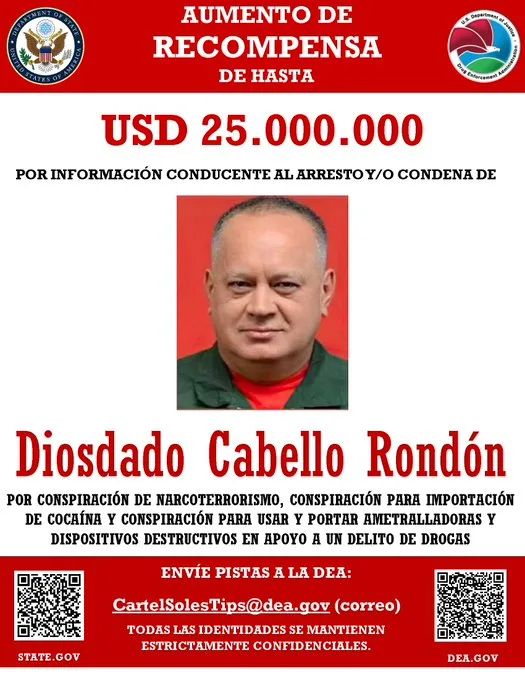 El viernes 8 en la mañana, también anunció recompensas más sustanciosas por Diosdado Cabello, por quien pagaría $25.000.000 y por Vladimir Padrino, $15.000.000.
