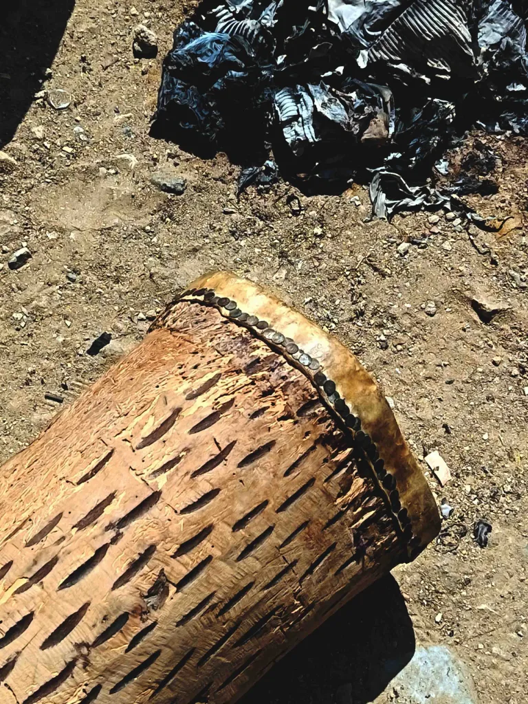 El cumaco de Las Morenas, elaborado con tronco de árbol de aguacate, tachuelas y cuero donado por amigos de la cultura. Foto: HONOR 400 Lite.