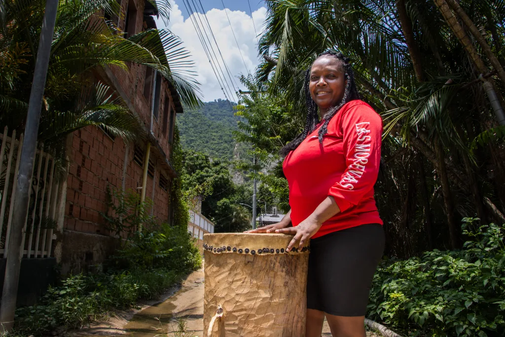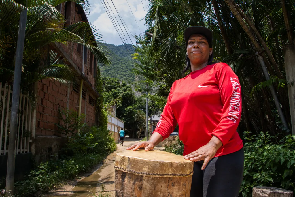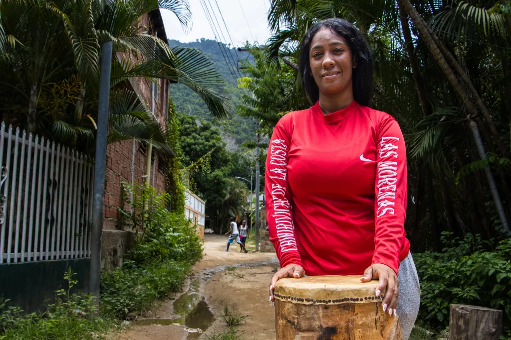 —Una mañana estábamos en el trabajo y una tía me dijo: “¡Ay! ¿por qué no hacemos un grupo de tambor femenino?”. Yo le dije: «Ay, qué bueno”. Vine para mi casa, le informé a mi hermana y se motivó—, cuenta Yulimar Mayora, la coordinadora de Las Morenas de Chichi y la encargada de tocar el medio bajo.