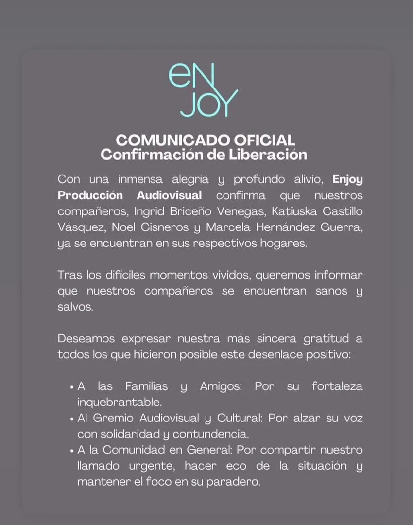 Enjoy Producción Audiovisual también confirmó la liberación de las productoras y de los tesistas a través del siguiente comunicado: