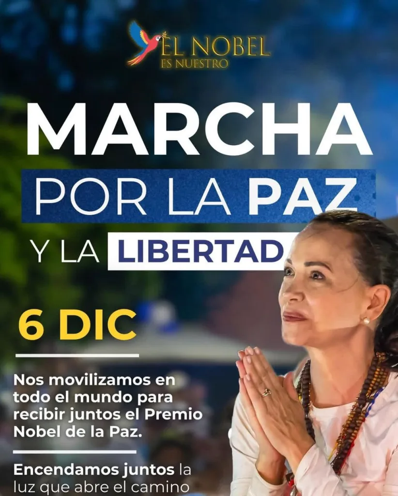 María Corina Machado Parisca, líder de la oposición mundial venezolana y ganadora del Premio Nobel de la Paz 2025, convocó a una marcha mundial para el 6 de diciembre, fecha que coincide con la entrega del prestigioso galardón.