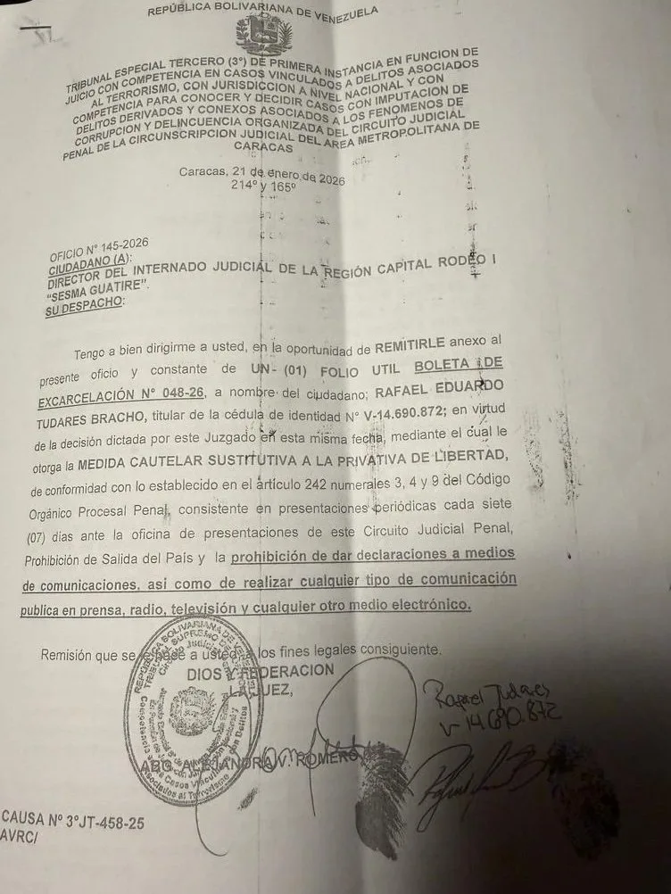 Rafael Tudares Bracho, yerno de Edmundo González Urrutia, fue excarcelado durante la madrugada de este jueves 22 de enero, informó su esposa, Mariana González de Tudares, a través de una publicación en X.