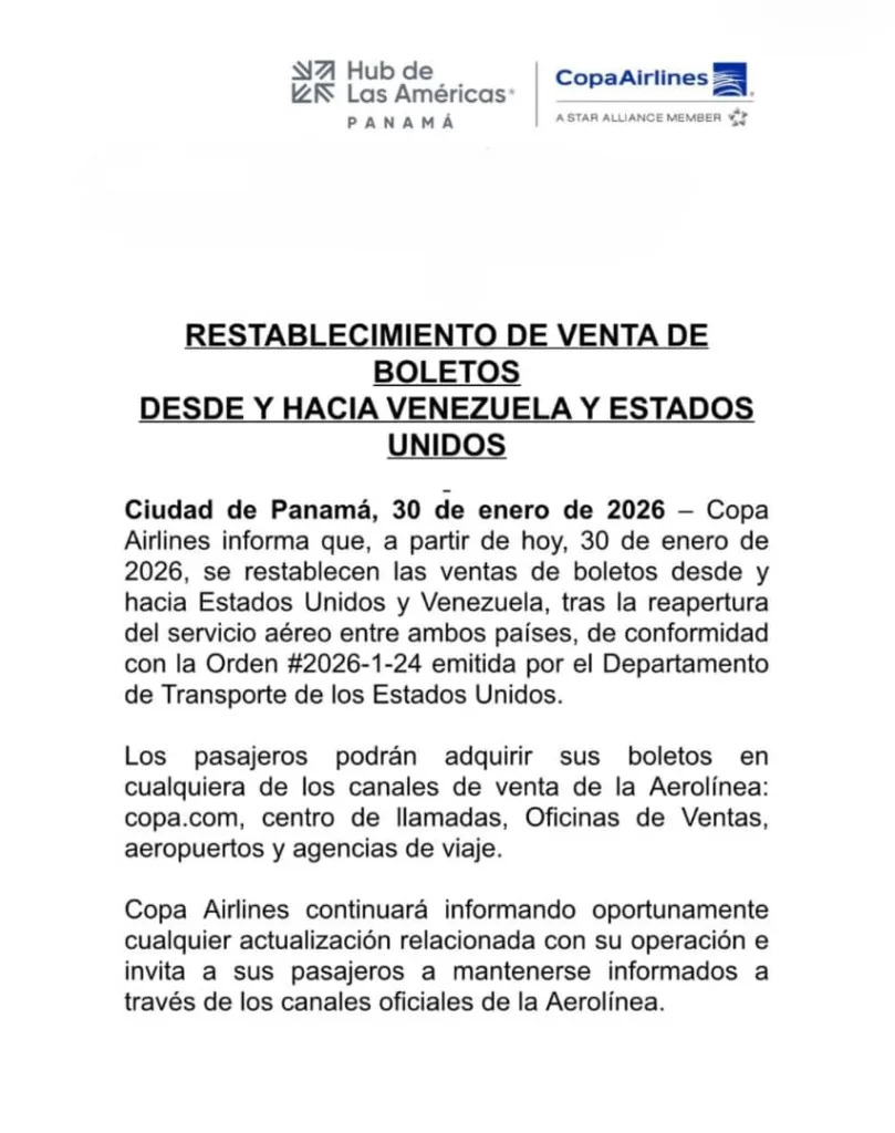 Copa Airlines dijo en un comunicado que si bien restableció la venta de boletos desde y hacia Estados Unidos y Venezuela, esto no significa que haya un vuelo directo. Todos los vuelos pasan por una escala en Panamá y los pasajeros no necesitarán hacer trámites migratorios en ese país.